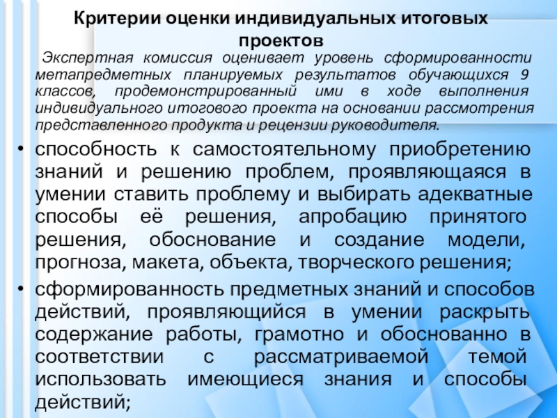 Слайд 11Критерии оценки индивидуальных итоговых проектов