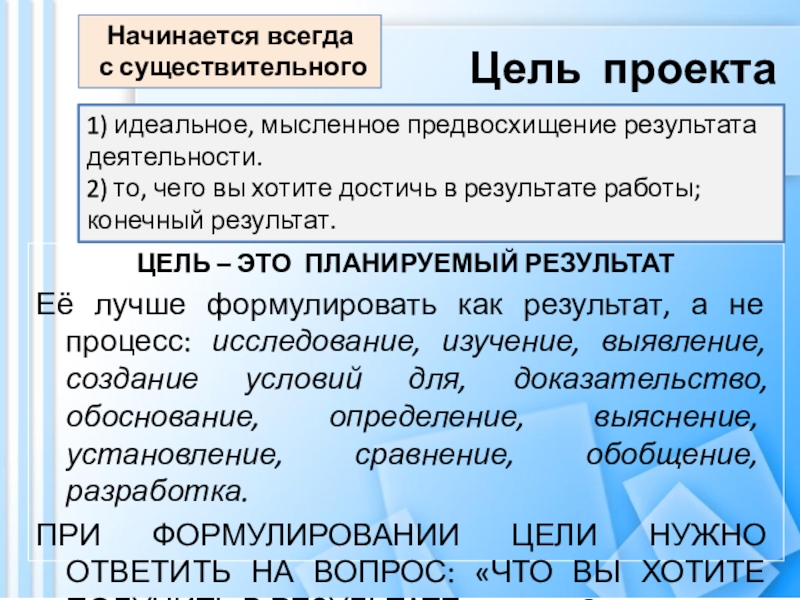 ПРИ ФОРМУЛИРОВАНИИ ЦЕЛИ НУЖНО ОТВЕТИТЬ НА ВОПРОС: «ЧТО ВЫ ХОТИТЕ ПОЛУЧИТЬ В РЕЗУЛЬТАТЕ проекта?»