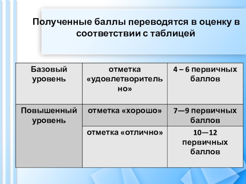 Слайд 14 Полученные баллы переводятся в оценку в соответствии с таблицей