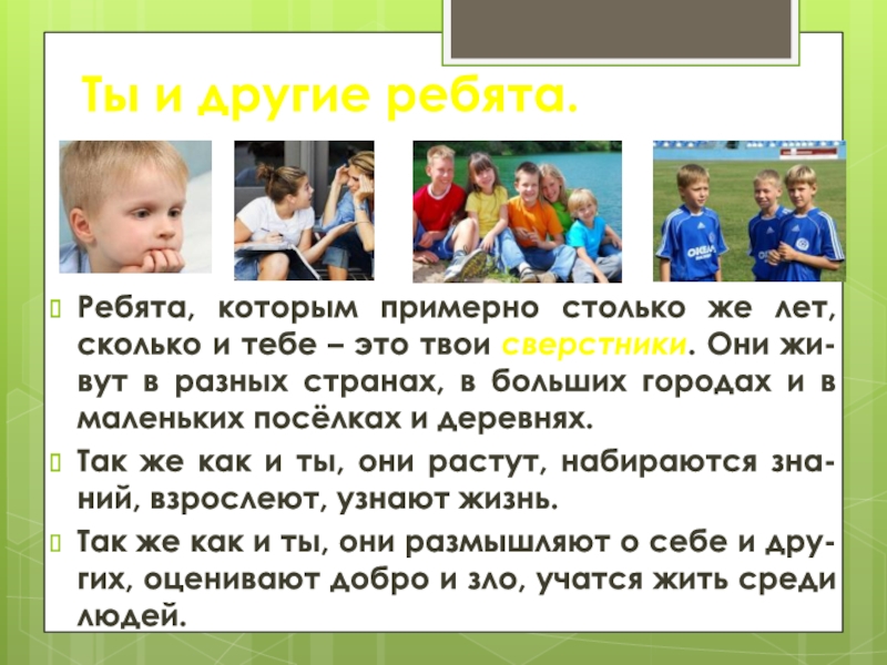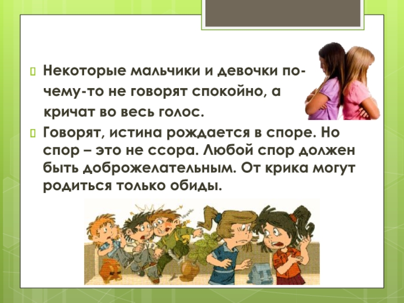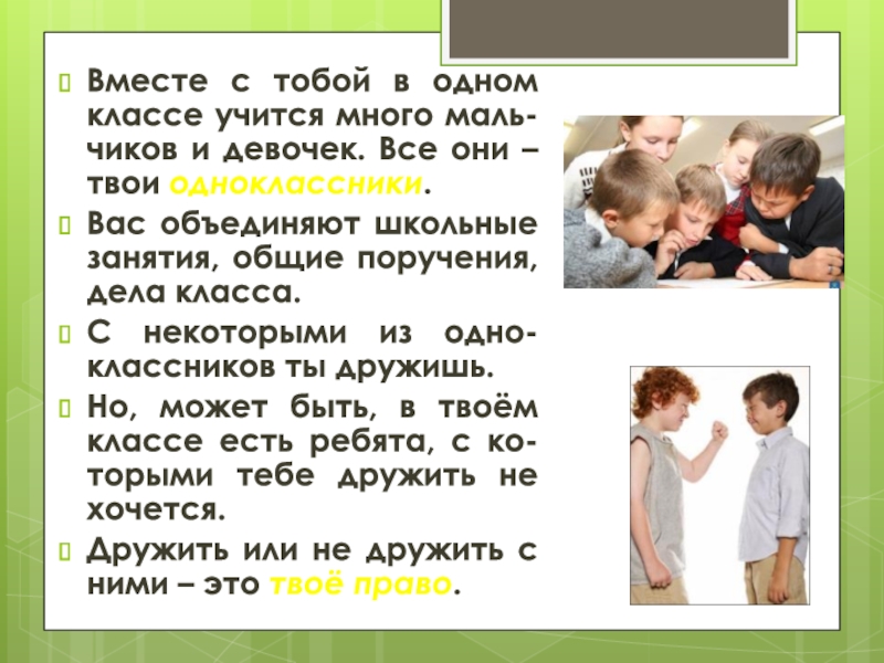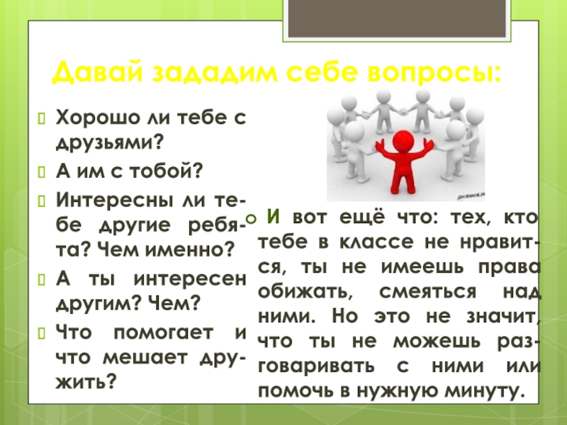 И вот ещё что: тех, кто тебе в классе не нравит-ся, ты не имеешь права обижать, смеяться над ними. Но это не значит, что ты не можешь раз-говаривать с ними или помочь в нужную минуту.