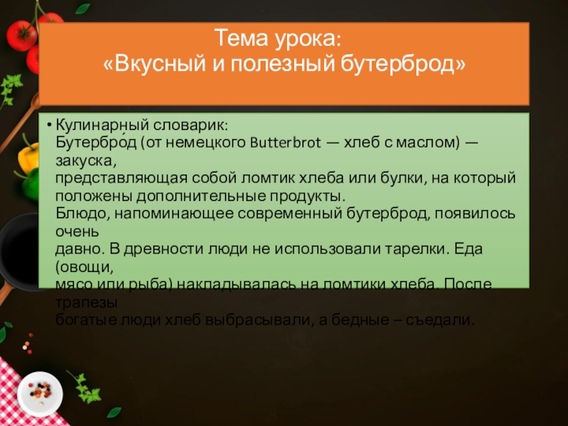 Бутербро́д (от немецкого Butterbrot — хлеб с маслом) — закуска,