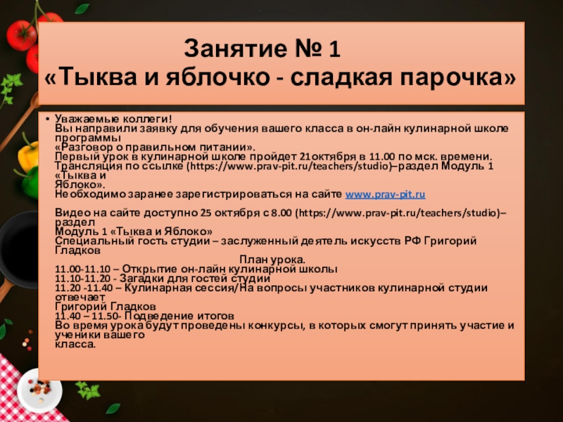 Трансляция по ссылке (https://www.prav-pit.ru/teachers/studio)–раздел Модуль 1 «Тыква и