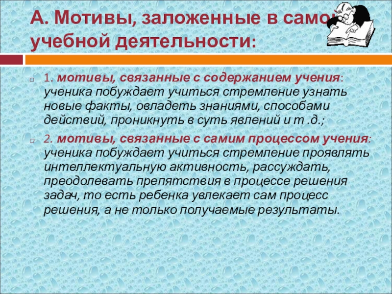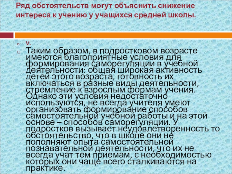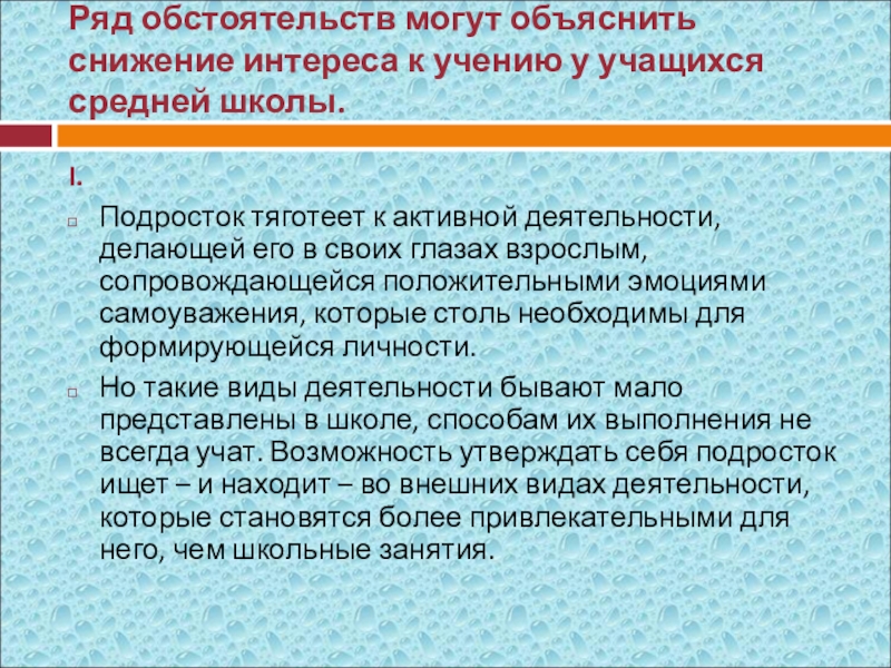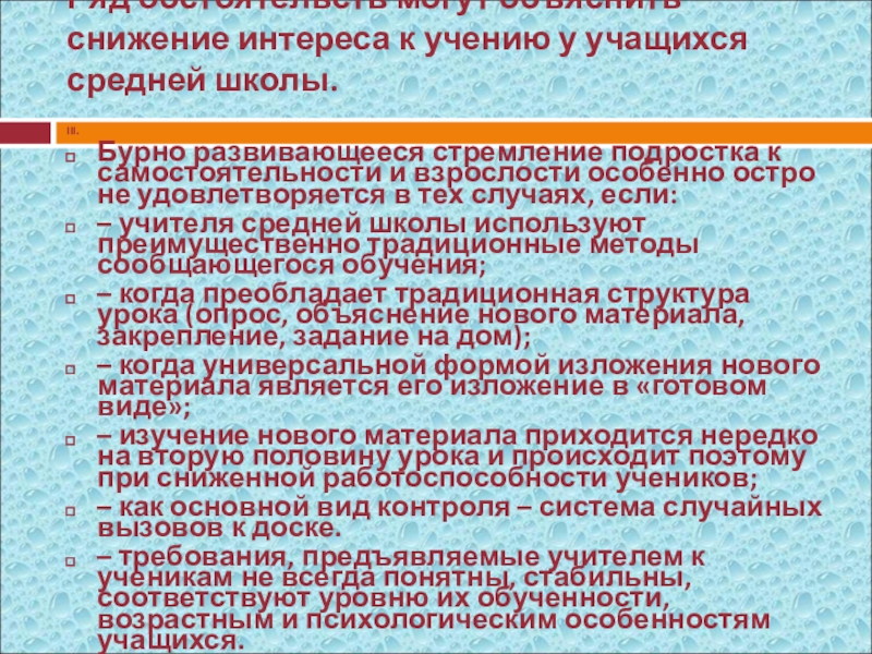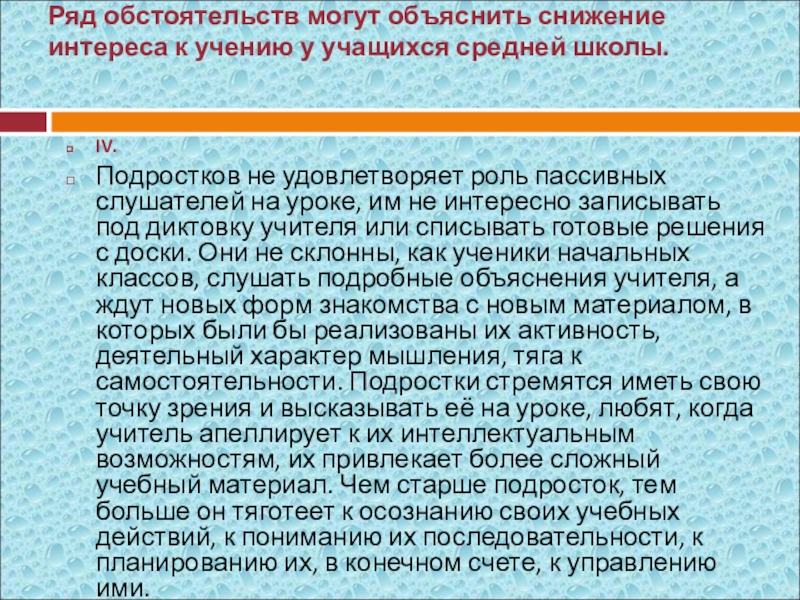Подростков не удовлетворяет роль пассивных слушателей на уроке, им не интересно записывать под диктовку учителя или списывать готовые решения с доски. Они не склонны, как ученики начальных классов, слушать подробные объяснения учителя, а ждут новых форм знакомства с новым материалом, в которых были бы реализованы их активность, деятельный характер мышления, тяга к самостоятельности. Подростки стремятся иметь свою точку зрения и высказывать её на уроке, любят, когда учитель апеллирует к их интеллектуальным возможностям, их привлекает более сложный учебный материал. Чем старше подросток, тем больше он тяготеет к осознанию своих учебных действий, к пониманию их последовательности, к планированию их, в конечном счете, к управлению ими.