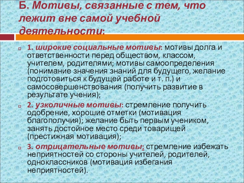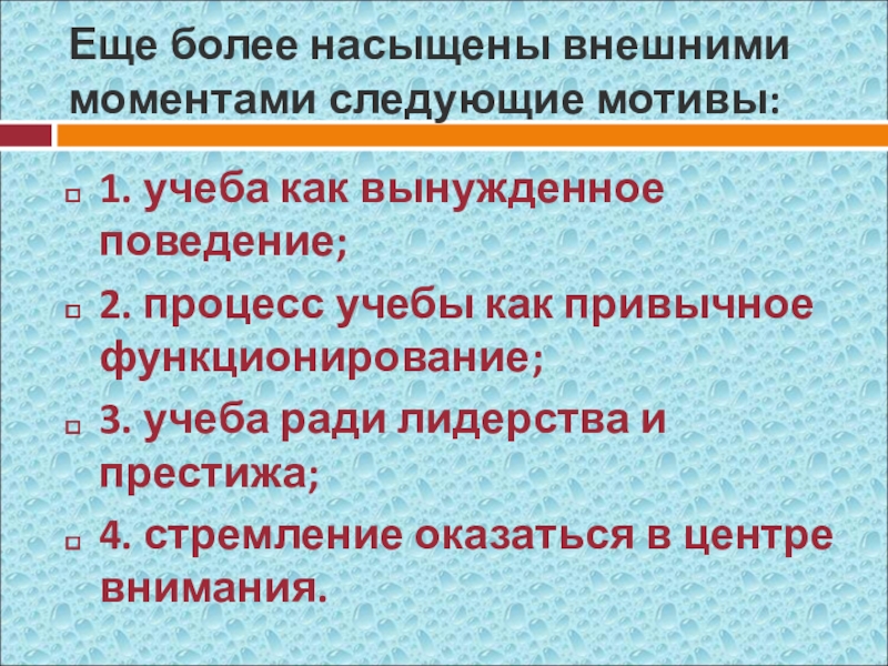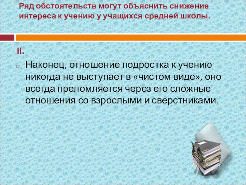Наконец, отношение подростка к учению никогда не выступает в «чистом виде», оно всегда преломляется через его сложные отношения со взрослыми и сверстниками.