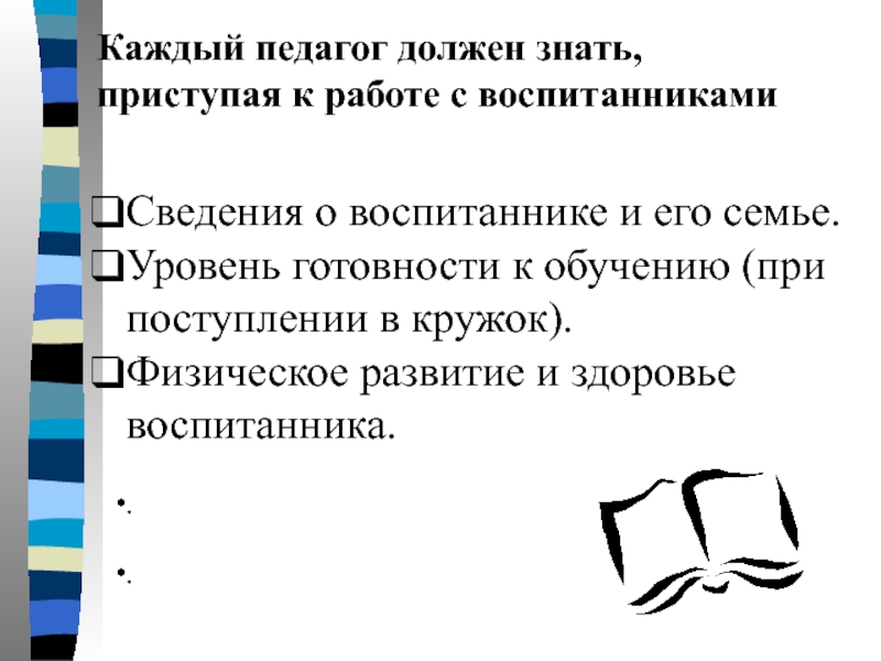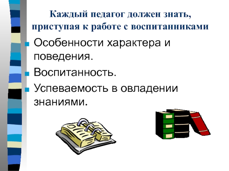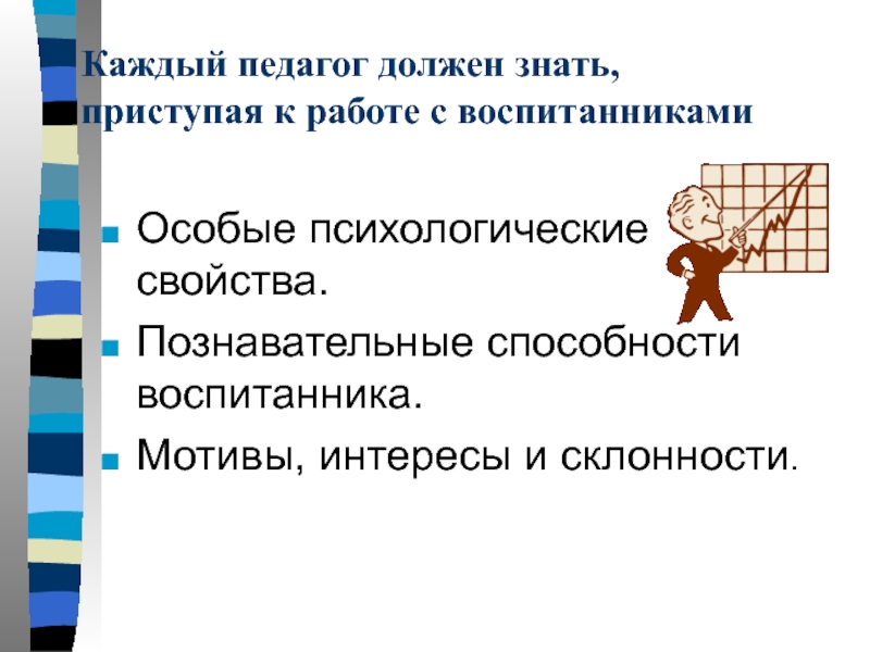 Слайд 8Каждый педагог должен знать, приступая к работе с воспитанниками