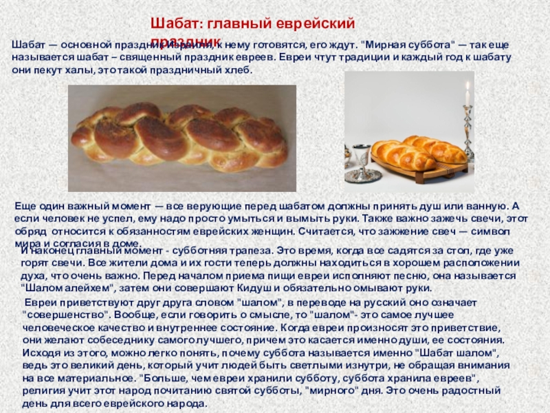 Евреи приветствуют друг друга словом "шалом", в переводе на русский оно означает "совершенство". Вообще, если говорить о смысле, то "шалом"- это самое лучшее человеческое качество и внутреннее состояние. Когда евреи произносят это приветствие, они желают собеседнику самого лучшего, причем это касается именно души, ее состояния. Исходя из этого, можно легко понять, почему суббота называется именно "Шабат шалом", ведь это великий день, который учит людей быть светлыми изнутри, не обращая внимания на все материальное. "Больше, чем евреи хранили субботу, суббота хранила евреев", религия учит этот народ почитанию святой субботы, "мирного" дня. Это очень радостный день для всего еврейского народа.