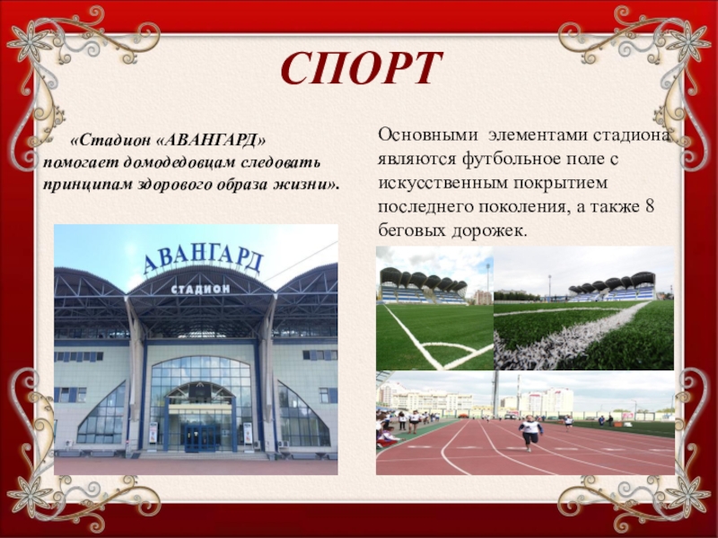 Основными элементами стадиона являются футбольное поле с искусственным покрытием последнего поколения, а также 8 беговых дорожек.