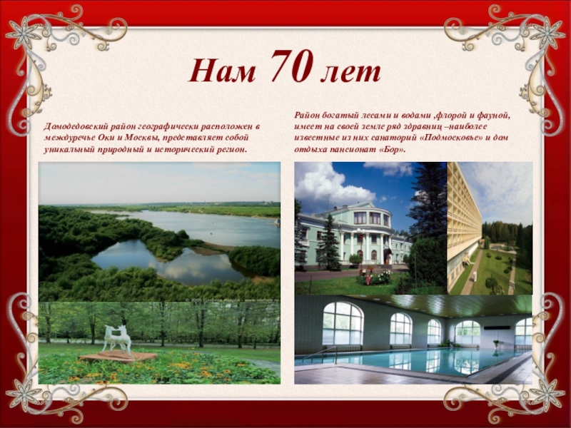 Район богатый лесами и водами ,флорой и фауной, имеет на своей земле ряд здравниц –наиболее известные из них санаторий «Подмосковье» и дом отдыха пансионат «Бор».