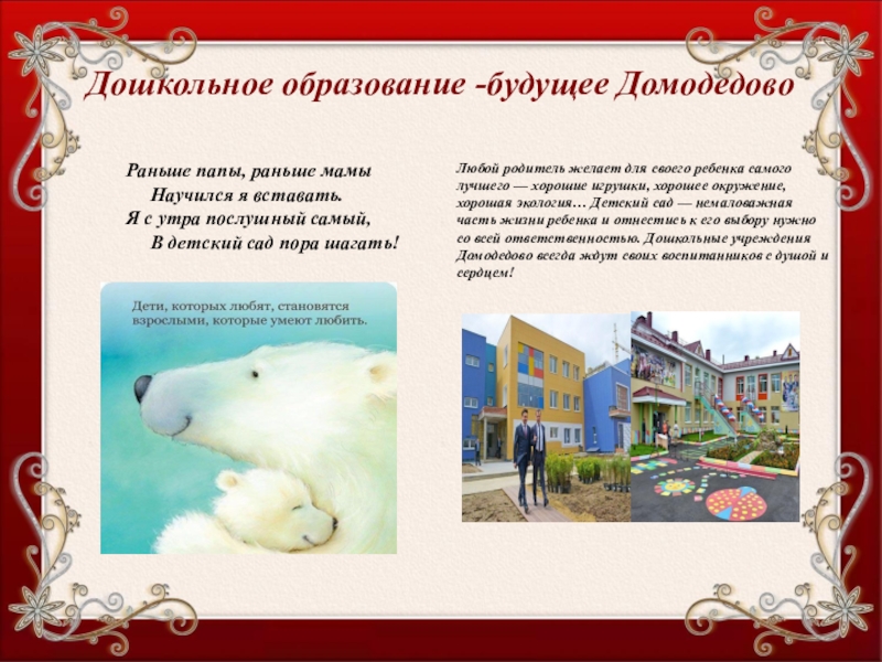 Любой родитель желает для своего ребенка самого лучшего — хорошие игрушки, хорошее окружение, хорошая экология… Детский сад — немаловажная часть жизни ребенка и отнестись к его выбору нужно со всей ответственностью. Дошкольные учреждения Домодедово всегда ждут своих воспитанников с душой и сердцем!