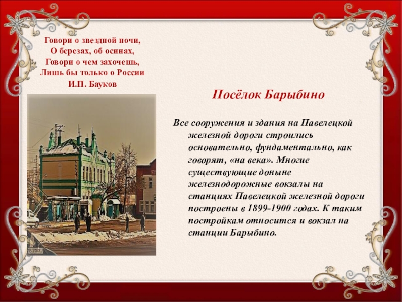 Все сооружения и здания на Павелецкой железной дороги строились основательно, фундаментально, как говорят, «на века». Многие существующие доныне железнодорожные вокзалы на станциях Павелецкой железной дороги построены в 1899-1900 годах. К таким постройкам относится и вокзал на станции Барыбино.