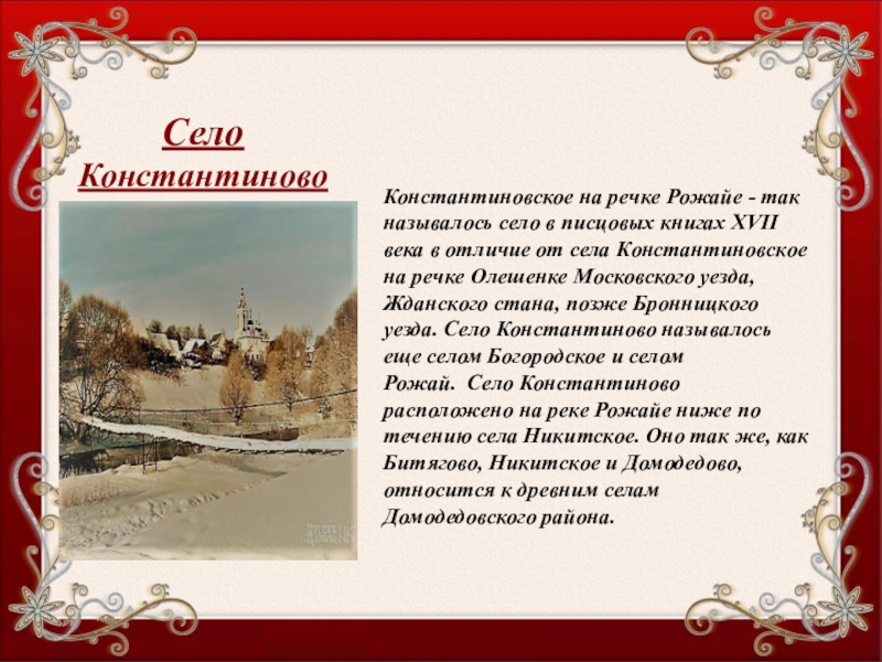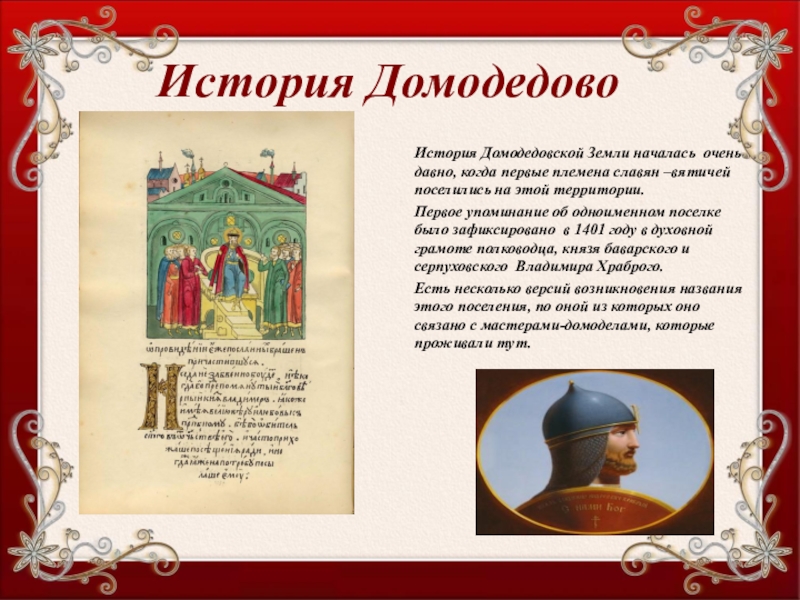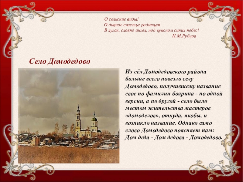 Из сёл Домодедовского района больше всего повезло селу Домодедово, получившему название свое по фамилии боярина - по одной версии, а по другой - село было местом жительства мастеров «домоделов», откуда, якобы, и возникло название. Однако само слово Домодедово поясняет нам: Дом деда - Дом дедова - Домодедово.