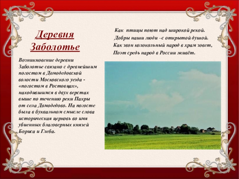 Возникновение деревни Заболотье связано с древнейшим погостом в Домодедовской волости Московского уезда - «погостом в Ростовцах», находившимся в двух верстах выше по течению реки Пахры от села Домодедово. На погосте была в буквальном смысле слова историческая церковь во имя убиенных благоверных князей Бориса и Глеба.