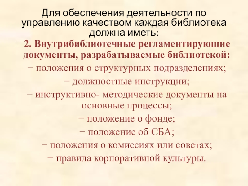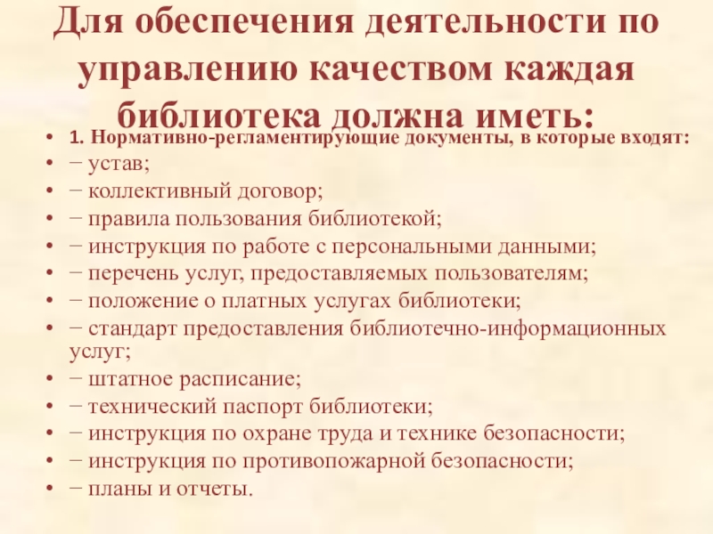 Для обеспечения деятельности по управлению качеством каждая библиотека должна иметь: