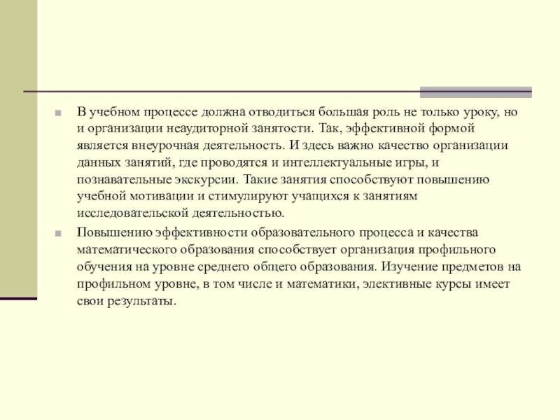 но и организации неаудиторной занятости. Так, эффективной формой является внеурочная деятельность. И здесь важно качество организации данных занятий, где проводятся и интеллектуальные игры, и познавательные экскурсии. Такие занятия способствуют повышению учебной мотивации и стимулируют учащихся к занятиям исследовательской деятельностью.