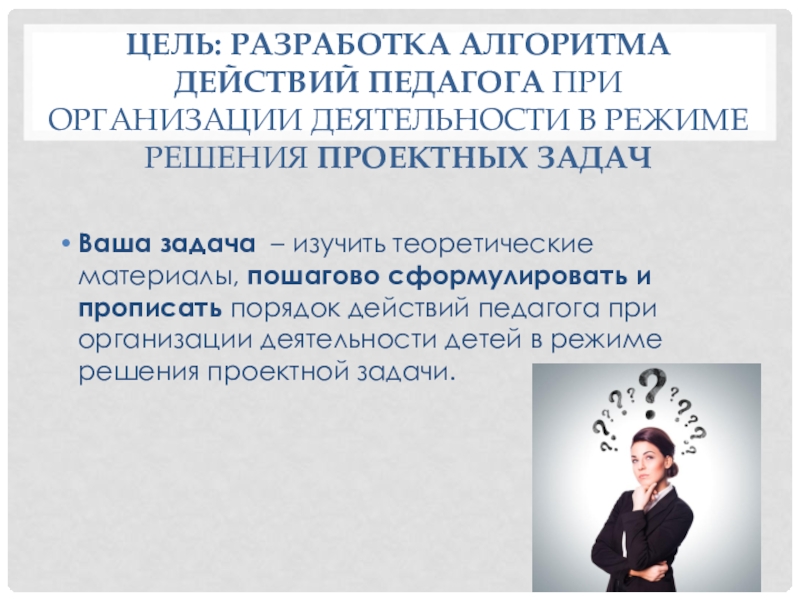 Ваша задача – изучить теоретические материалы, пошагово сформулировать и прописать порядок действий педагога при организации деятельности детей в режиме решения проектной задачи.
