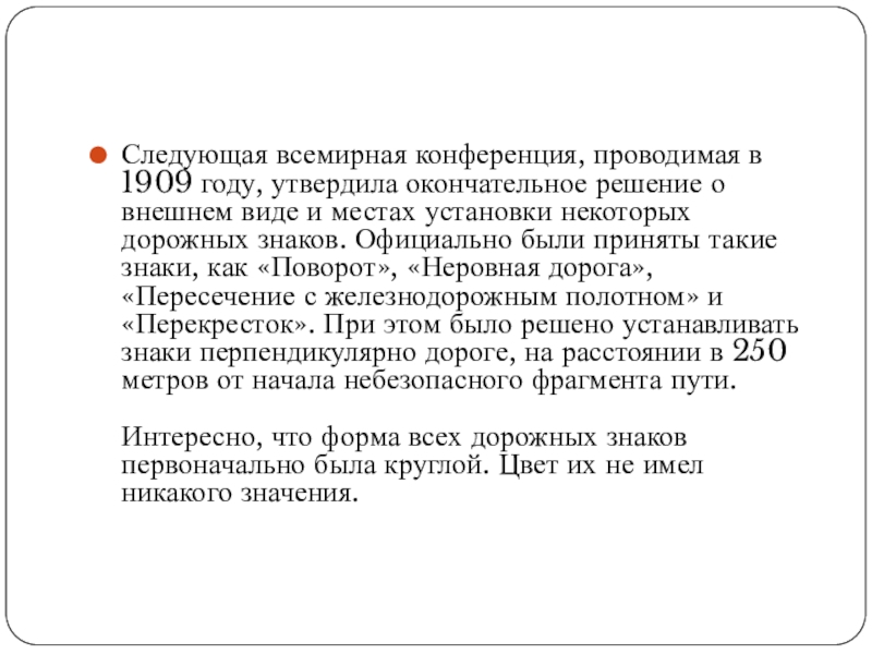 внешнем виде и местах установки некоторых дорожных знаков. Официально были приняты такие знаки, как «Поворот», «Неровная дорога», «Пересечение с железнодорожным полотном» и «Перекресток». При этом было решено устанавливать знаки перпендикулярно дороге, на расстоянии в 250 метров от начала небезопасного фрагмента пути. Интересно, что форма всех дорожных знаков первоначально была круглой. Цвет их не имел никакого значения.