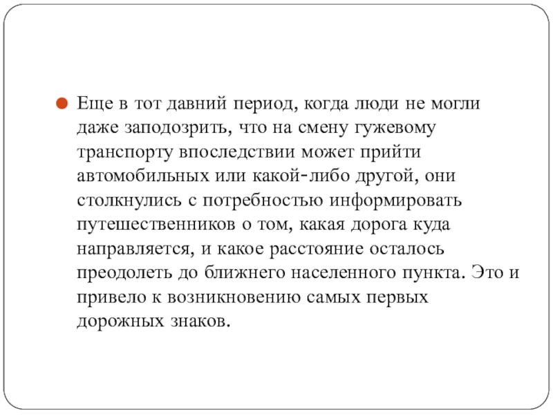 что на смену гужевому транспорту впоследствии может прийти автомобильных или какой-либо другой, они столкнулись с потребностью информировать путешественников о том, какая дорога куда направляется, и какое расстояние осталось преодолеть до ближнего населенного пункта. Это и привело к возникновению самых первых дорожных знаков.