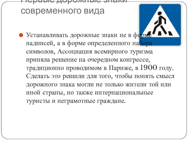 а в форме определенного набора символов, Ассоциация всемирного туризма приняла решение на очередном конгрессе, традиционно проводимом в Париже, в 1900 году. Сделать это решили для того, чтобы понять смысл дорожного знака могли не только жители той или иной страны, но также интернациональные туристы и неграмотные граждане.