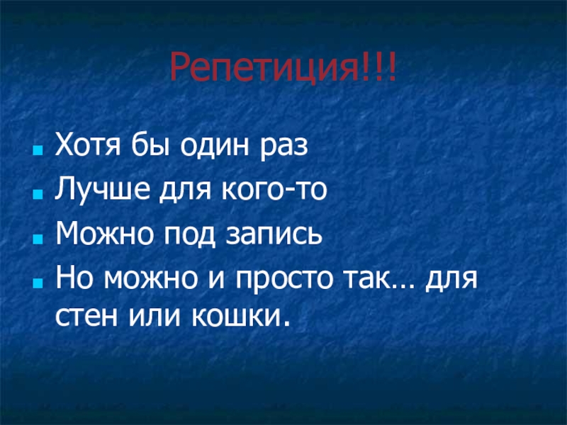 Репетиция!!!Хотя бы один разЛучше для кого-тоМожно под записьНо можно и просто так… для стен или кошки.