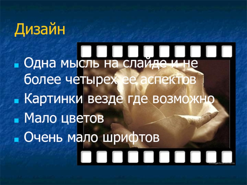 ДизайнОдна мысль на слайде и не более четырех ее аспектовКартинки везде где возможноМало цветовОчень мало шрифтов
