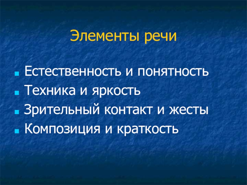 Элементы речиЕстественность и понятностьТехника и яркостьЗрительный контакт и жестыКомпозиция и краткость