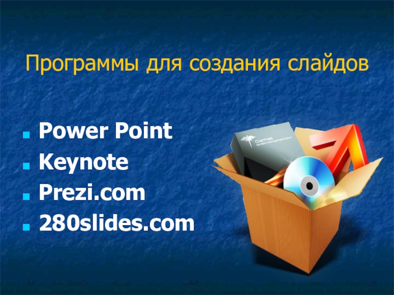 Программы для создания слайдовPower PointKeynotePrezi.com280slides.com