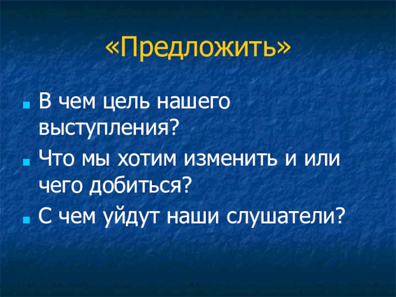 «Предложить»В чем цель нашего выступления?Что мы хотим изменить и или чего добиться?С чем уйдут наши слушатели?