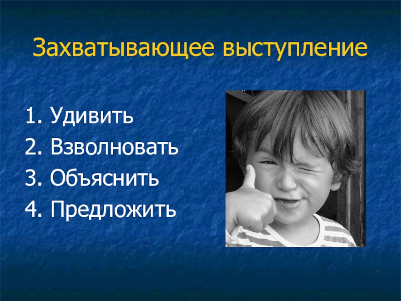 Захватывающее выступление1. Удивить2. Взволновать3. Объяснить4. Предложить