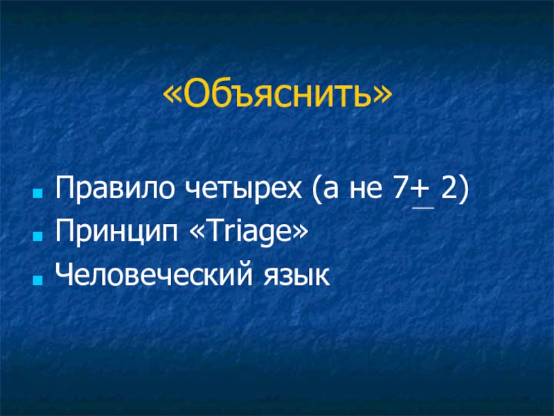 «Объяснить»Правило четырех (а не 7+ 2)Принцип «Triage»Человеческий язык