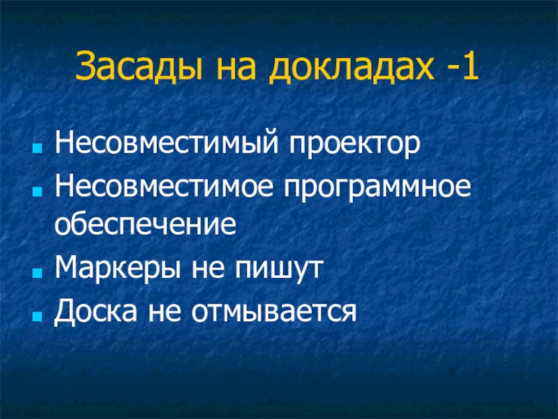 Засады на докладах -1Несовместимый проекторНесовместимое программное обеспечениеМаркеры не пишутДоска не отмывается