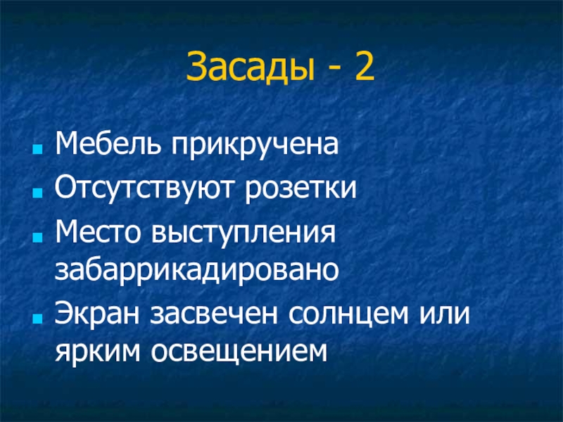 Засады - 2Мебель прикрученаОтсутствуют розеткиМесто выступления забаррикадированоЭкран засвечен солнцем или ярким освещением