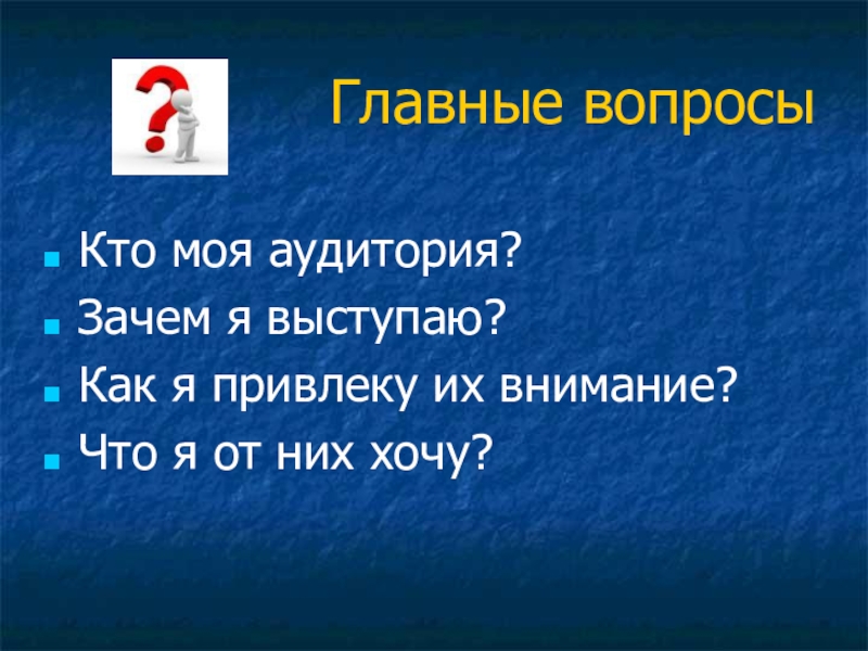 Главные вопросыКто моя аудитория?Зачем я выступаю?Как я привлеку их внимание?Что я от них хочу?