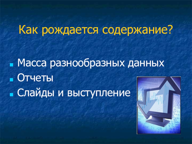 Как рождается содержание?Масса разнообразных данныхОтчетыСлайды и выступление