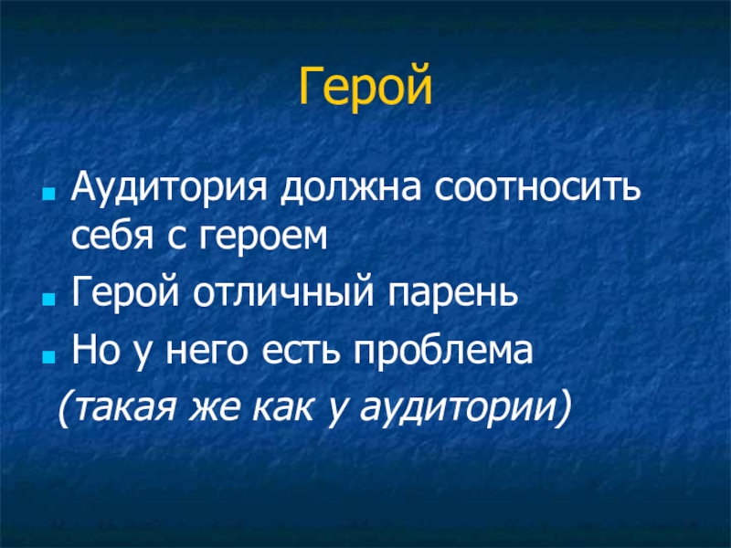 ГеройАудитория должна соотносить себя с героемГерой отличный пареньНо у него есть проблема (такая же как у аудитории)