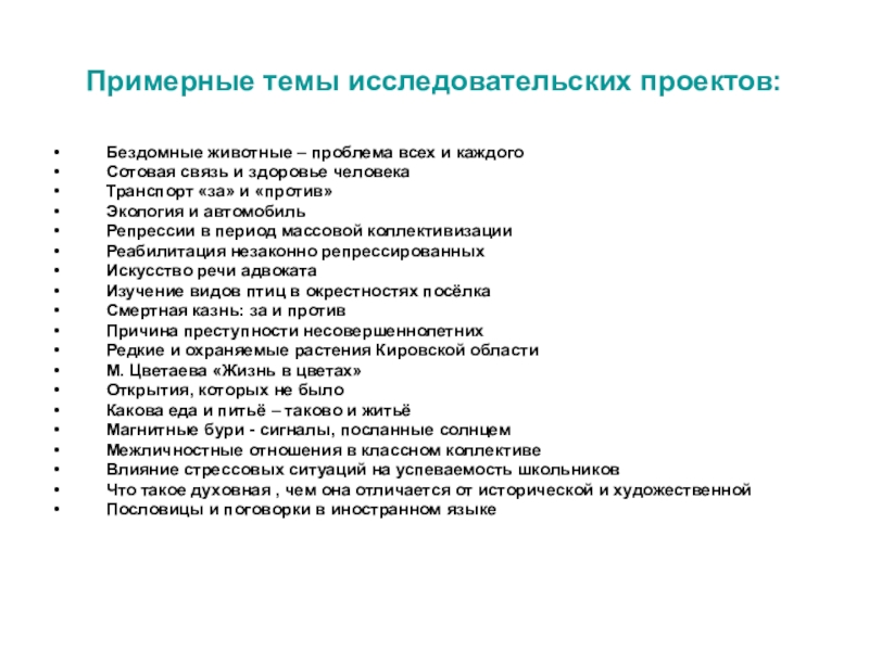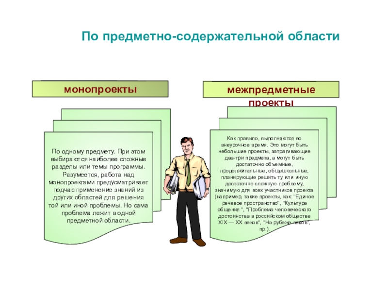 Как правило, выполняются во внеурочное время. Это могут быть небольшие проекты, затрагивающие два-три предмета, а могут быть достаточно объемные, продолжительные, общешкольные, планирующие решить ту или иную достаточно сложную проблему, значимую для всех участников проекта (например, такие проекты, как: "Единое речевое пространство", "Культура общения ", "Проблема человеческого достоинства в российском обществе XIX — XX веков", "На рубеже веков", пр.).