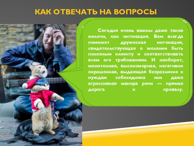 Сегодня очень важны даже такие мелочи, как интонация. Вам всегда поможет дружеская интонация, свидетельствующая о желании быть полезным клиенту и соответствовать всем его требованиям. И наоборот, монотонная, высокомерная, негативно окрашенная, выдающая безразличие к нуждам собеседника или даже агрессивная манера речи — прямая дорога к провалу.