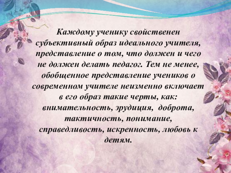 Слайд 13Каждому ученику свойственен субъективный образ идеального учителя, представление о том, что