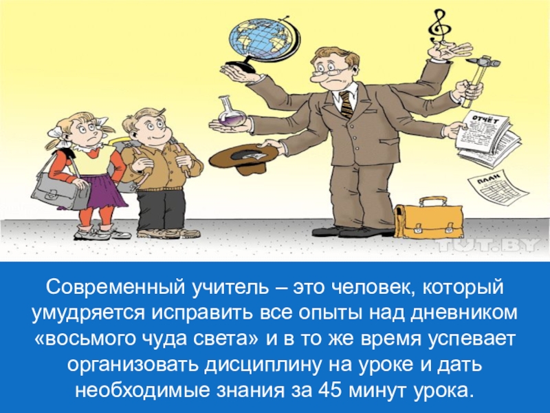 Слайд 4Современный учитель – это человек, который умудряется исправить все опыты над