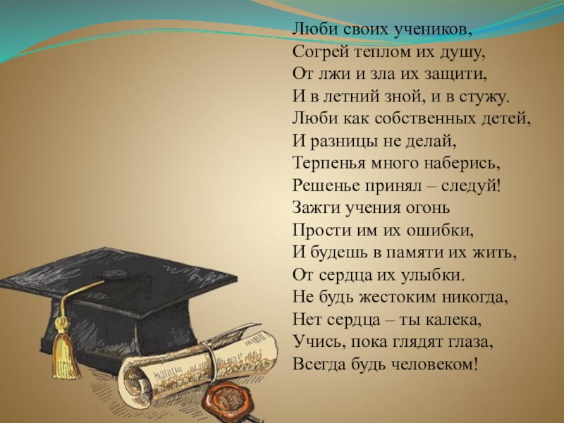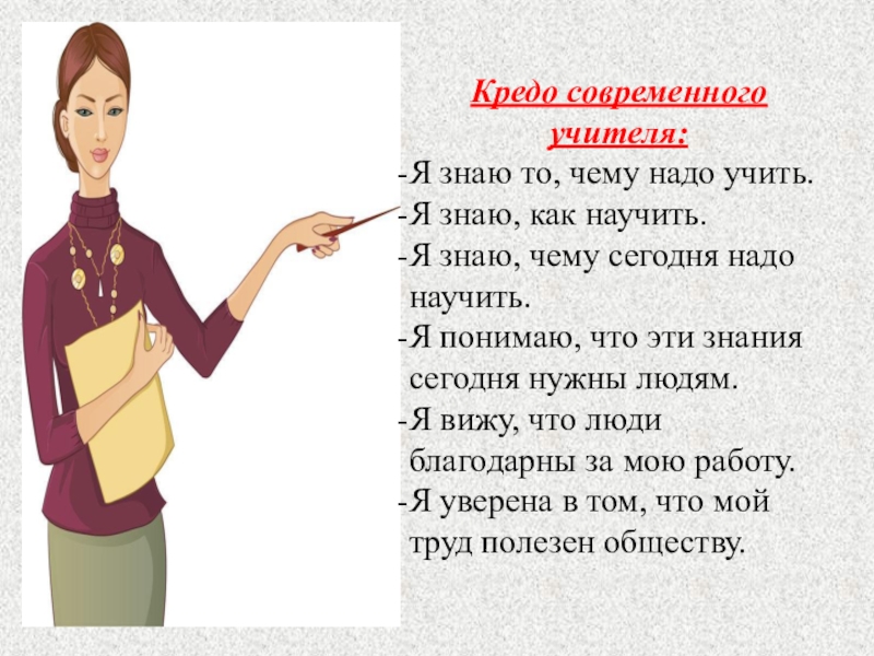 должен и чего не должен делать педагог. Тем не менее, обобщенное представление учеников о современном учителе неизменно включает в его образ такие черты, как: внимательность, эрудиция, доброта, тактичность, понимание, справедливость, искренность, любовь к детям.