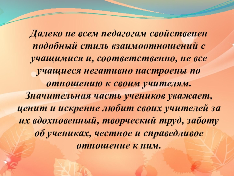 Слайд 12Далеко не всем педагогам свойственен подобный стиль взаимоотношений с учащимися и,