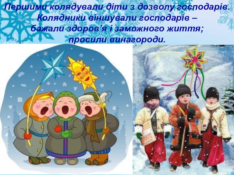 Слайд 10Першими колядували діти з дозволу господарів. Колядники віншували господарів –