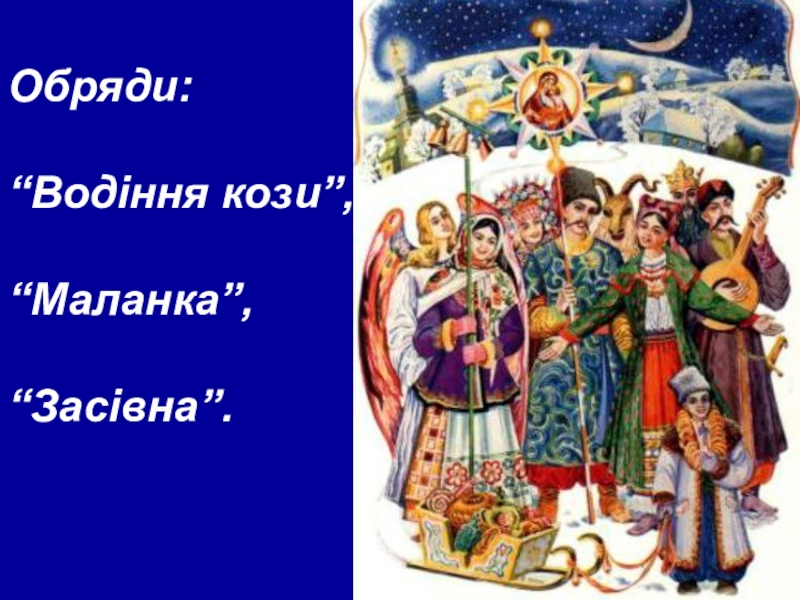 Слайд 13Обряди: “Водіння кози”, “Маланка”, “Засівна”.