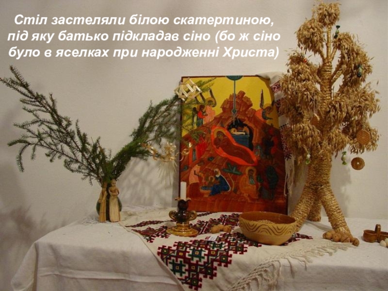 Слайд 6Стіл застеляли білою скатертиною, під яку батько підкладав сіно (бо ж