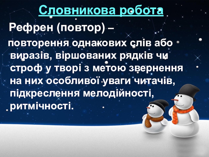Словникова робота  Рефрен (повтор) –  повторення однакових слів або виразів, віршованих рядків чи строф у