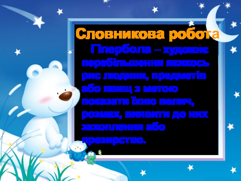 Словникова робота   Гіпербола – художнє перебільшення якихось рис людини, предметів або явищ з метою показати