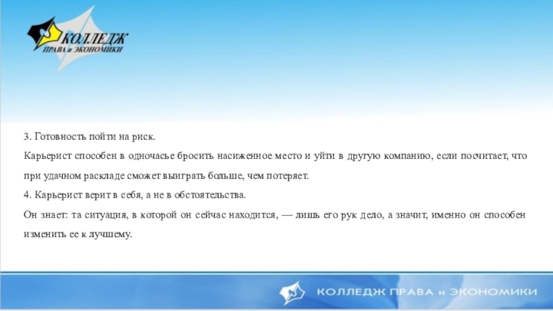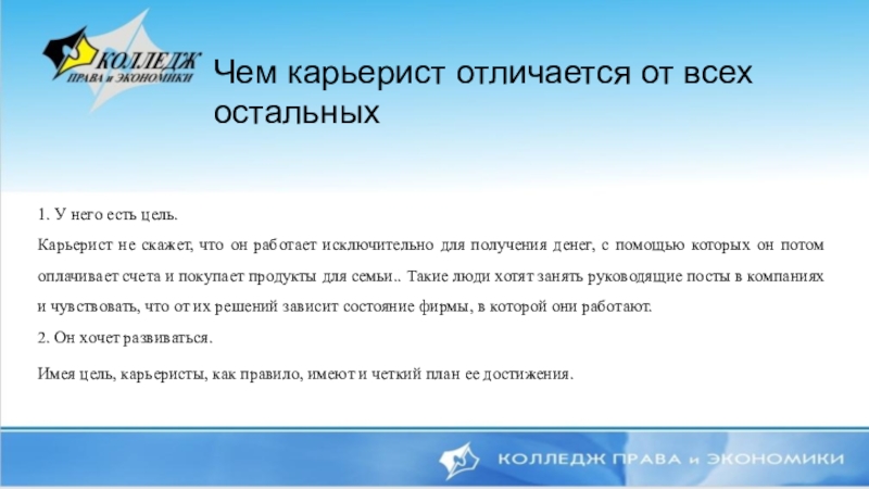 2) Воплощение идей в жизнь. Карьеристы более инициативны как в работе, так и в жизни. Они чаще добиваются поставленных задач.