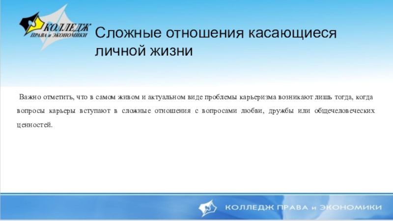 и актуальном виде проблемы карьеризма возникают лишь тогда, когда вопросы карьеры вступают в сложные отношения с вопросами любви, дружбы или общечеловеческих ценностей.