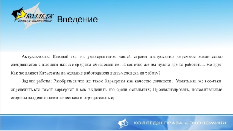 Задачи работы: Разобраться,что же такое Карьеризм как качество личности; Узнать,как же все-таки определить,кто такой карьерист и как выделить его среди остальных; Проанализировать, положительные стороны владения таким качеством и отрицательные;