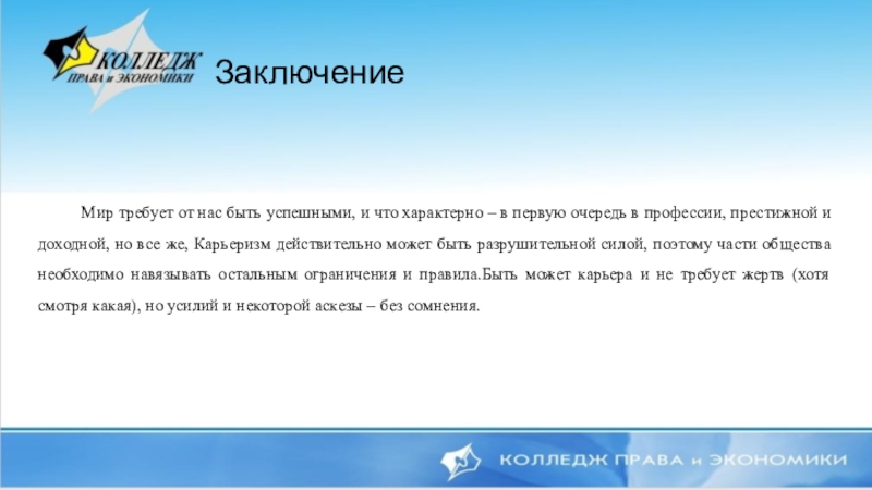 первую очередь в профессии, престижной и доходной, но все же, Карьеризм действительно может быть разрушительной силой, поэтому части общества необходимо навязывать остальным ограничения и правила.Быть может карьера и не требует жертв (хотя смотря какая), но усилий и некоторой аскезы – без сомнения.