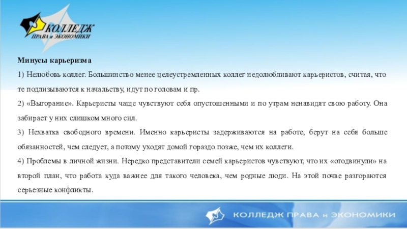 1) Нелюбовь коллег. Большинство менее целеустремленных коллег недолюбливают карьеристов, считая,